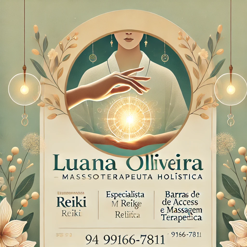 Merchandising Se você quer experimentar os benefícios dessa técnica milenar, agende sua sessão com Luana Oliveira, Massoterapeuta Holística. Especialista em Reiki, Barras de Access e Massagem Terapêutica, Luana oferece atendimentos personalizados para alívio de dores, equilíbrio emocional e relaxamento profundo.